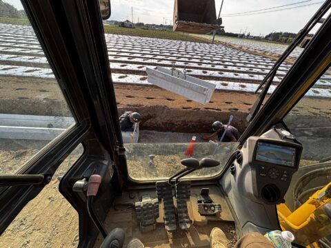まずは掘削を行い、側溝を設置していくための準備からスタートしました。重機を使って丁寧に掘り進め、まっすぐに施工できるように慎重に作業を進めます。